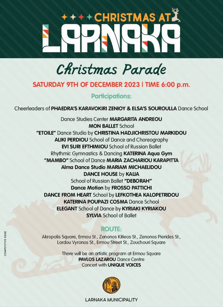 В субботу, 9 декабря, муниципалитет Ларнаки проведет Рождественский парад с участием кипрского Деда Мороза, чирлидерш и танцевальных школ города. Праздничная процессия стартует в 18:00. На время проведения парада часть улиц в центре Ларнаки будут перекрыты.