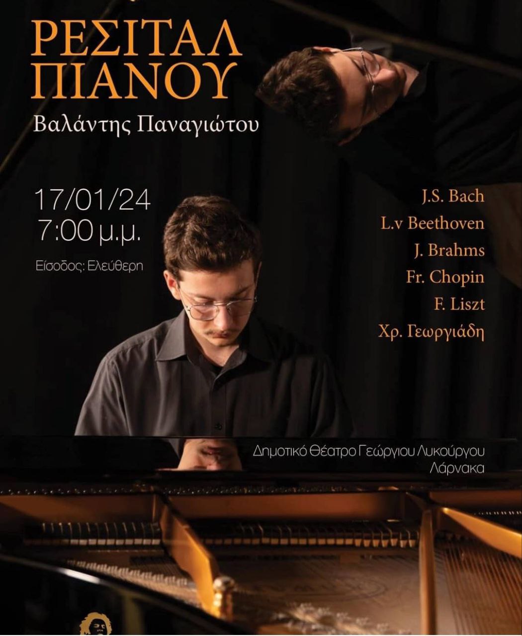В среду 17/01 в муниципальном театре будет реситаль Валандис Панайоту фортепиано. Очень талантливый парень. Вход свободный.