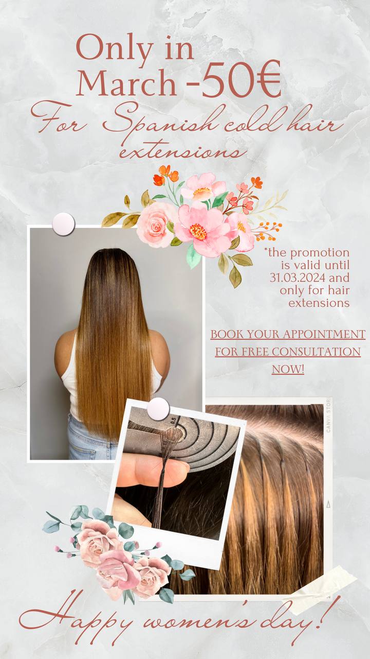 Дорогие дамы🌷 В честь праздника 8 марта мы дарим вам скидку -50€ на испанское холодное наращивание волос в период с 01.03.2024 по 31.03.2024 поэтому успевайте записываться к нам на БЕСПЛАТНУЮ консультацию💐