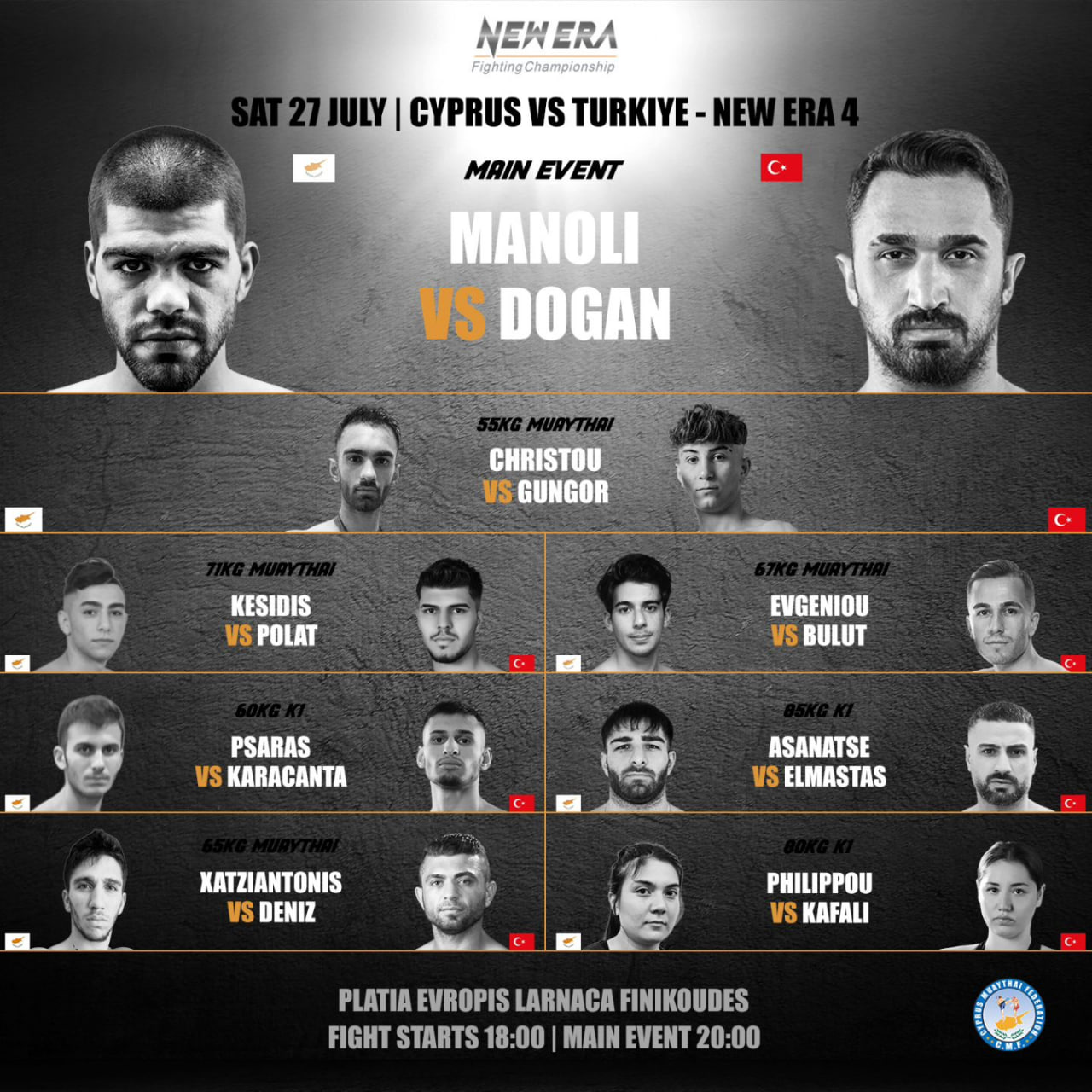 Вечером в субботу 27 июля на площади Европы у Финикудеса пройдёт турнир по тайскому боксу «Кипр vs. Турция» от местечкового промоушена.