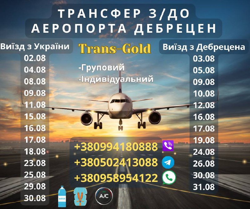 Індивідуальний та груповий трансфер від компанії TransGold. Забезпечуємо комфортабельні поїздки з/до аеропорту Дебрецен. Відмінний сервіс для вашої зручності та безпеки.