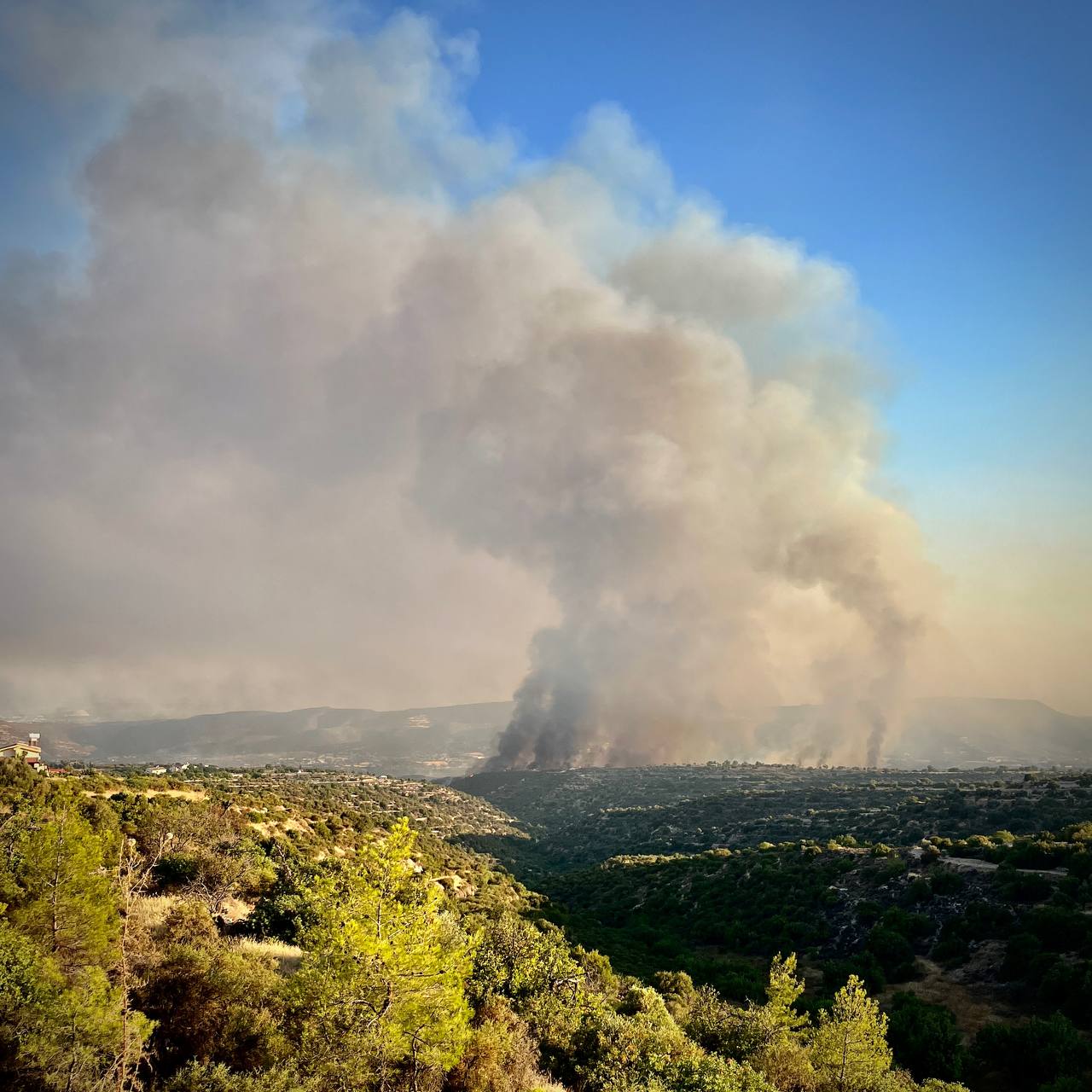 горит недалеко от выезда из Лимассола в сторону Тродоса, поэтому дым до города дотянуло. Я сейчас в Корфи, эпицентр чуть к югу от него, гребень холма горит.