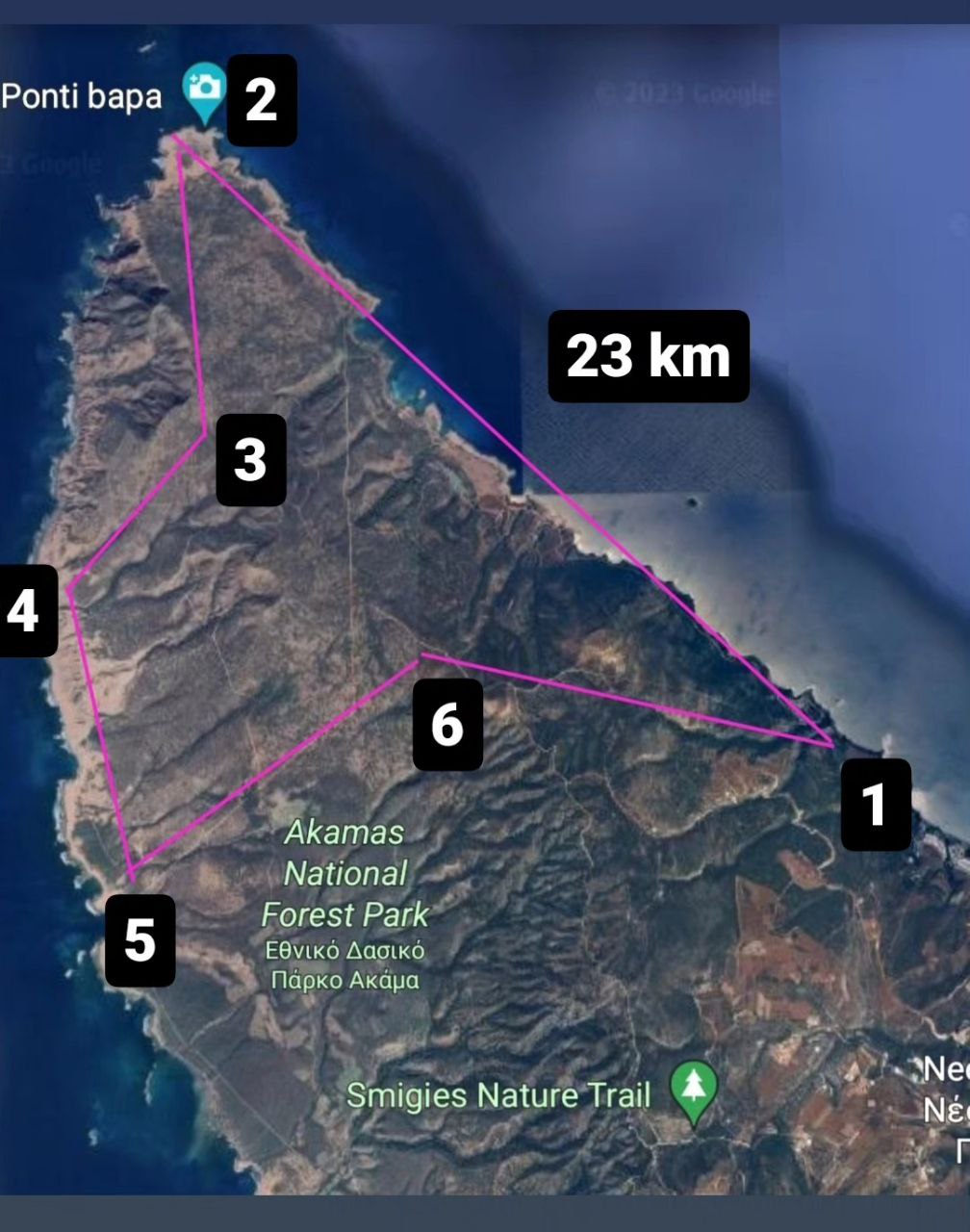 Я в свое время (ну, по весне) находил чуть более 30 километров за день, но это было с 8 утра до 19 часов вечера, и... По ровной дороге, грубо говоря, по Пафосу и пляжам вокруг него. Маршрут звучит заманчиво, но там отсутствуют напрочь точки эвакуации, то бишь дороги, где ездят машины. Если что-то приспичит, надо возвращаться на точку 1 или чесать до Авакаса.