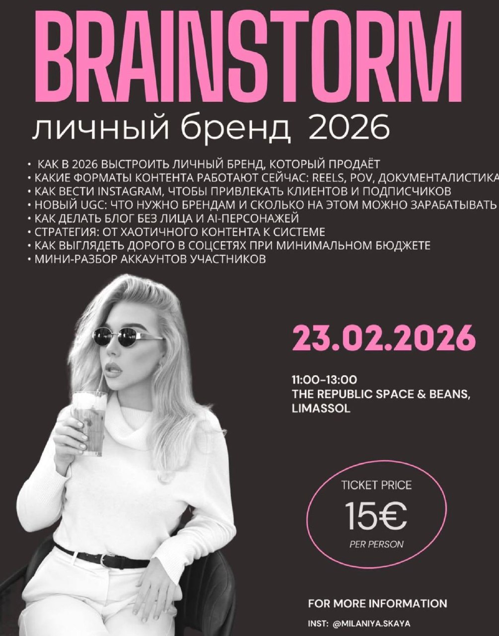 Приглашаю вас на мой офлайн-брейншторм «Личный бренд 2026» — для девушек, которые хотят выстроить сильный Instagram и начать зарабатывать системно.