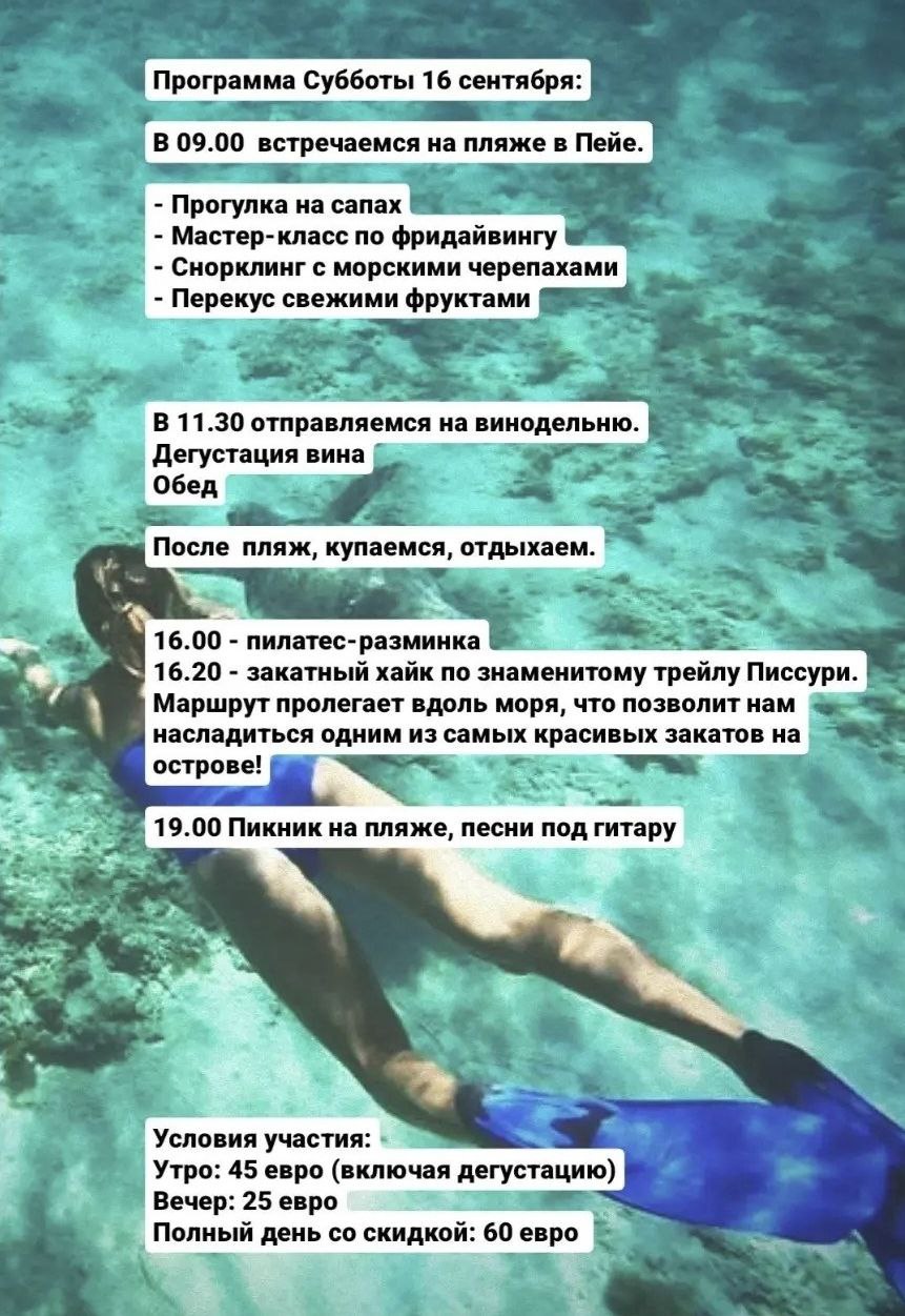 Всем привет! Пишите, кто ещё хочет присоединиться к активностям в эту субботу. Кипр предстанет перед нами во всей красе подводного мира, пейзажей и вкусов в компании не менее прекрасных людей 🤗Записаться и задать вопросы можно @m_markovna. Гитаристам и семьям с детьми - скидки😉