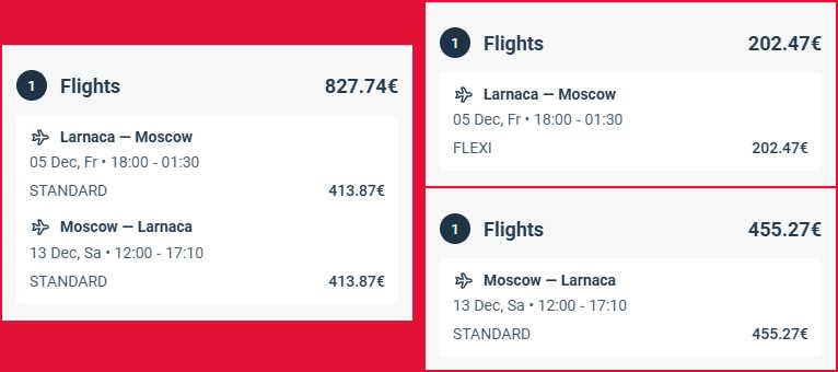 Например, рейс Georgian Airways по маршруту Ларнака - Москва - Ларнака с 5 по 13 декабря при бронировании «туда-обратно» обойдется в 828€. Однако если оформить перелет двумя отдельными билетами, картина меняется: