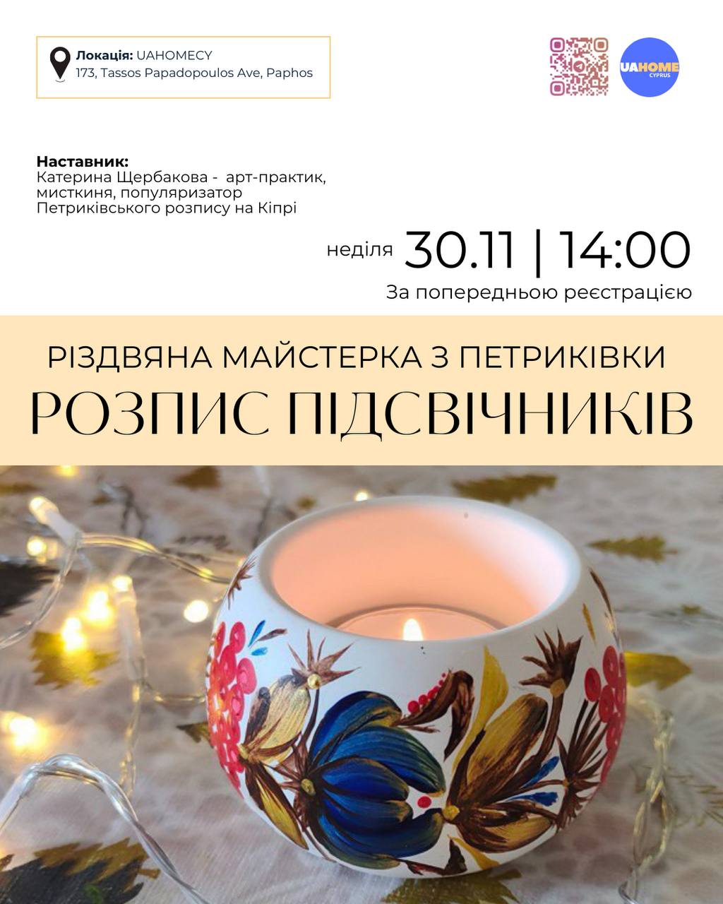 🌿 Майстер-клас проведе Катерина Щербакова — мисткиня та популяризаторка петриківського розпису на Кіпрі.