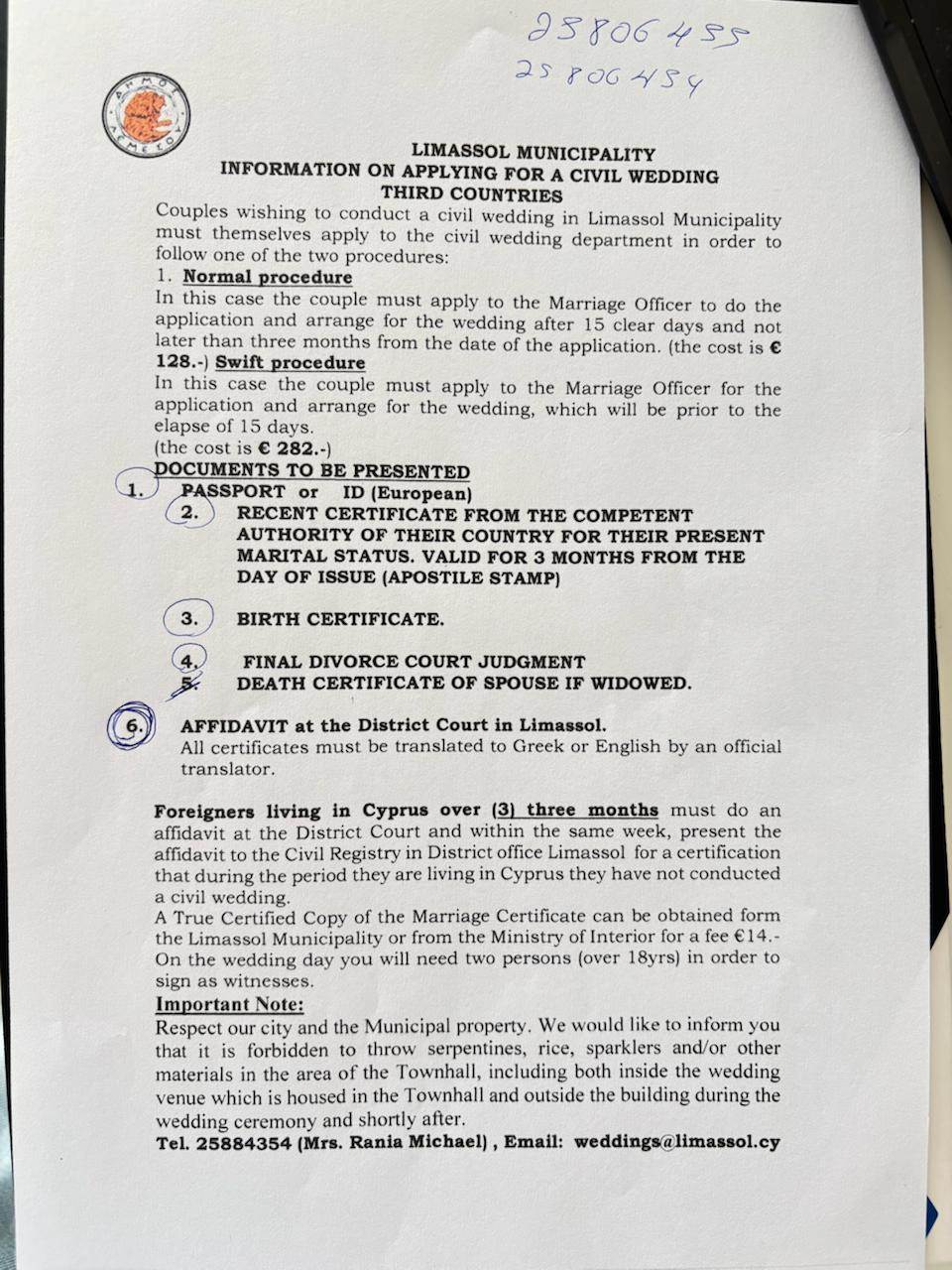 Мені радили такй порядок - збираєте всі докуенти. Ідете за Аффідавітом у місцевий District Court і в той же день (!) пишете заяву що хочете одружитися в Civil Registry. В Лімасолі він навпроти Зари на Анексертісіас.