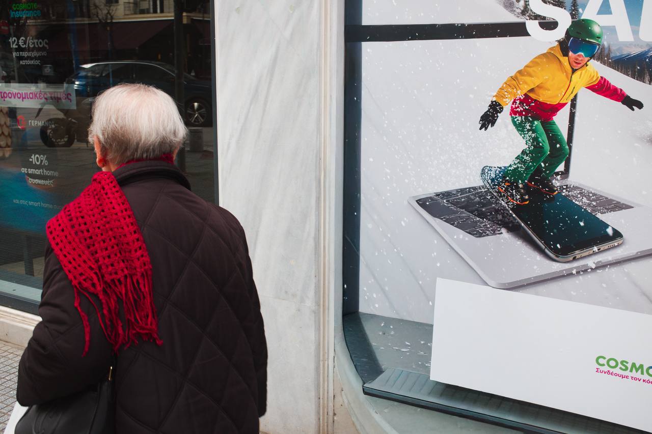 Немного контекста: сегодня на прогулке увидел эту бабулю с ярким шарфом и хотел поймать ее со сноубордистом. Показалось будет интересная игра в кадре но не вышло и попробовал убрать девушку в шубе.