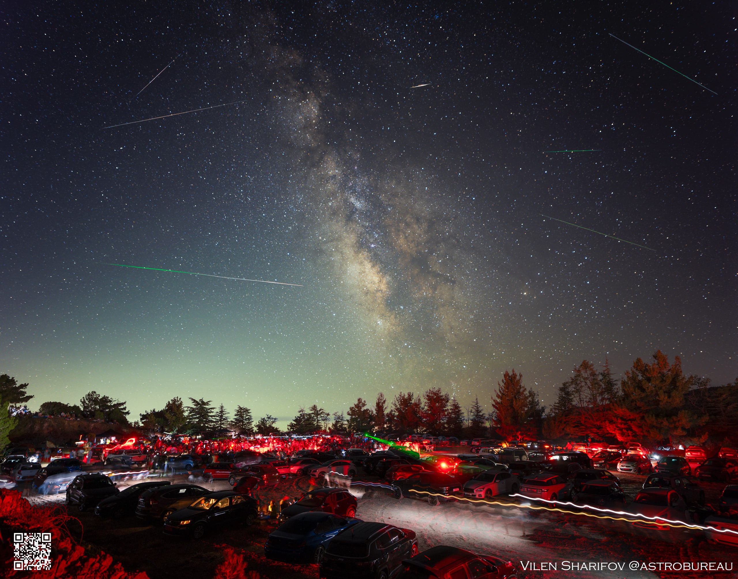 можно попробовать снующих людей с красными фонарями + уезжающие приезжающие машины использовать в качестве треков и соединить с метеорами ) (эту фотку снимал для конкурса местного каршеринга)