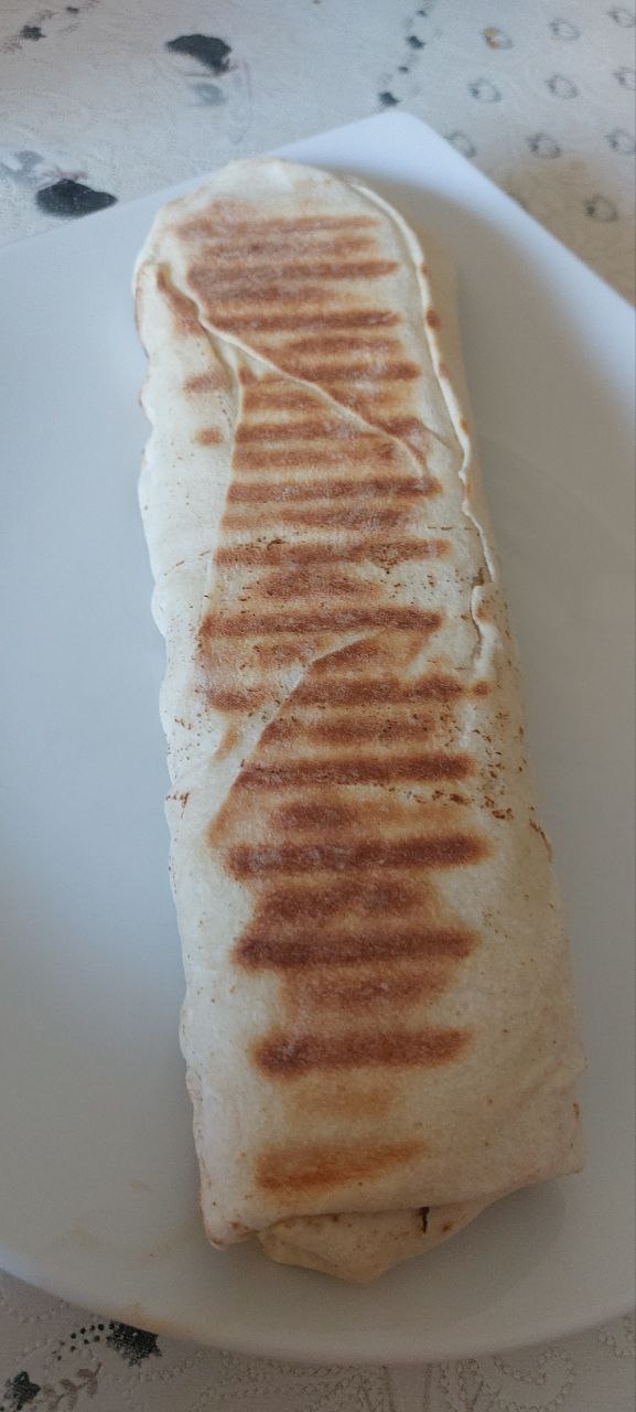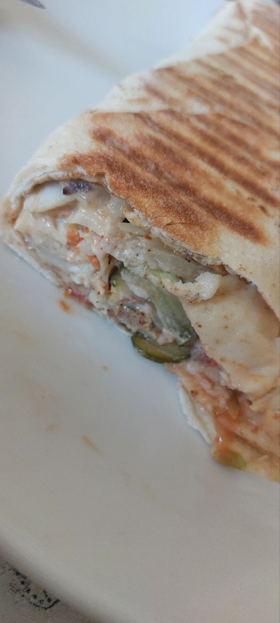 Да обычно. На лаваш выкладываем курицу, огурцы, помидоры, лук, соус. Заварачиваю конвертом и в двусторонний гриль.