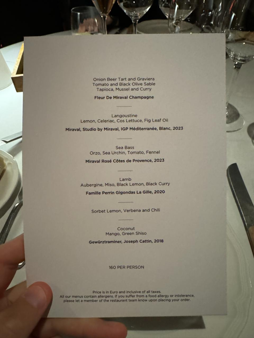Были с супругой в пятницу, в “меню” приглашенный повар у которого в одном из ресторанов было 2 звезды Мишлен, собственно из-за этого и пошли. Сет меню, 160 евро с винным сопровождением.