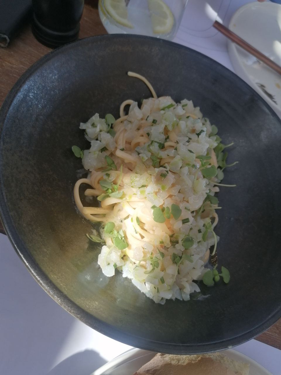 Мидии очень свежие, тарамосалата с копчёным вкусом и лаймом, лингвини с лимоном и рыбой... Интересные сочетания вкусов