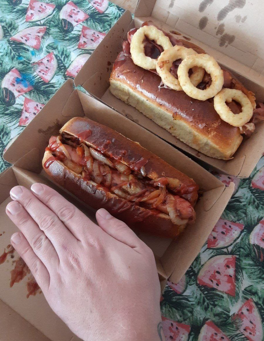 Народ. Заказали хот доги в Aura confectionery. Привезли вот таких монстров. Внутри 2 сосиски. Есть по классике не получится, тк булка огромная, никакой биг мак в сравнение не идёт. Приходилось использовать вилку и нож. В целом оценка 4 из 5. Минус балл за общую "сухость" хотдога (мало соусов)