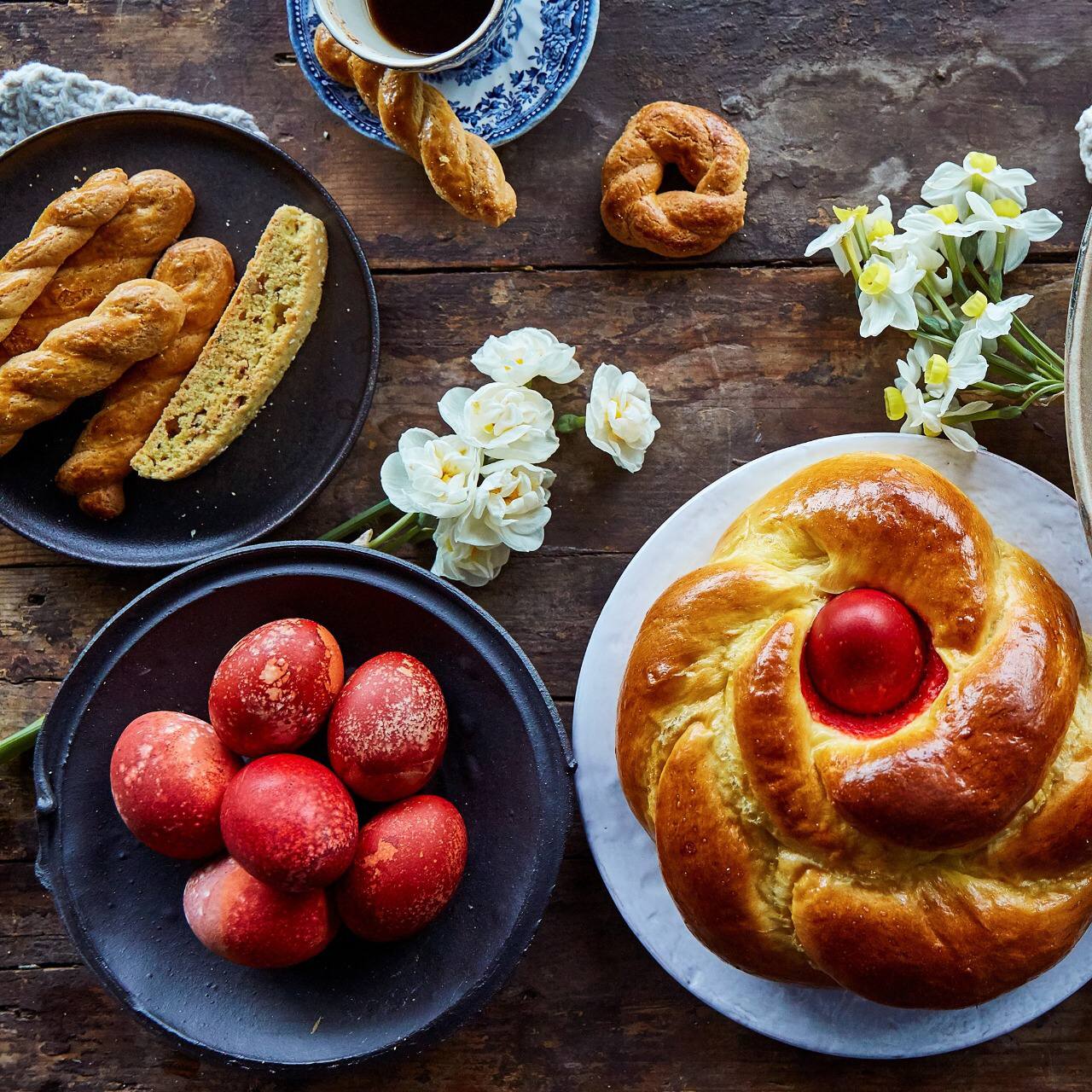 🔹На Пасху пекут и прочие виды выпечки: цуреки (сдобные булочки-плетенки), авготес (булочки с вставленными в углубления вареными яйцами), пироги с начинкой из мяса, лука и смеси сыров, пуреки с анари, песочное и миндальное печенье.
