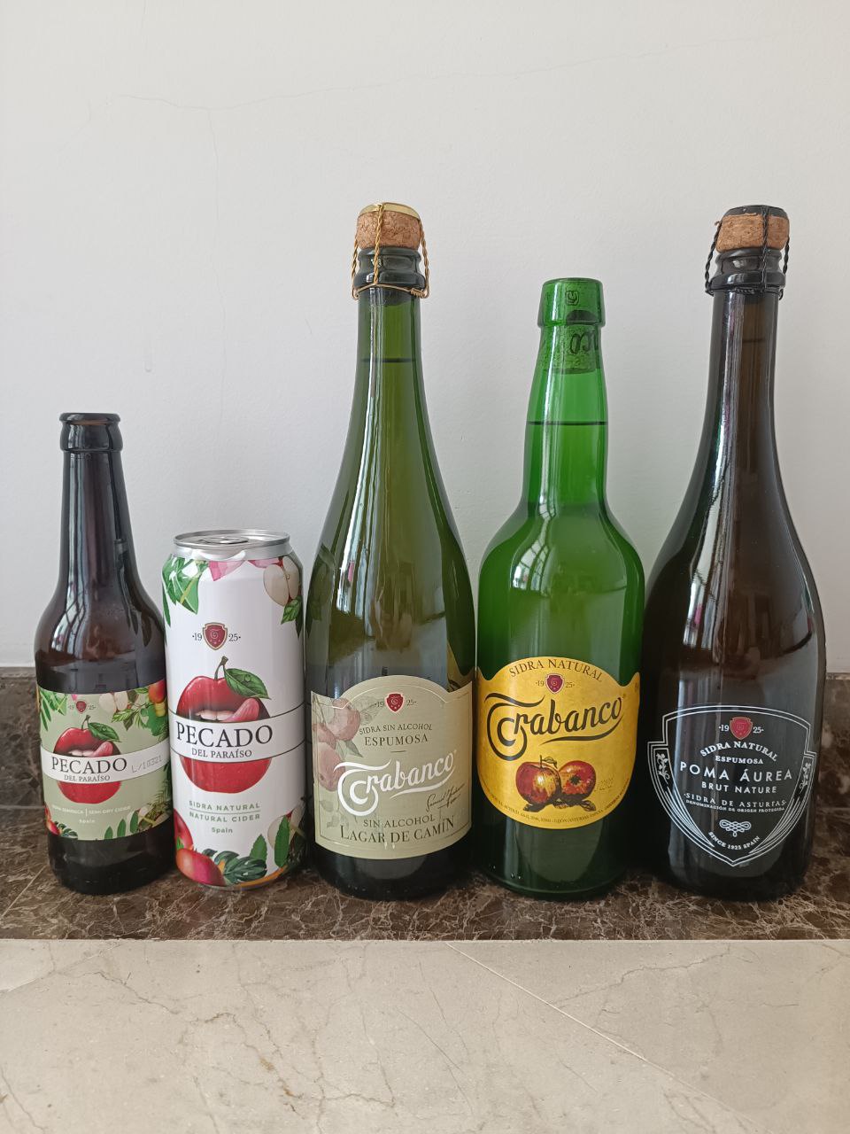 https://maps.app.goo.gl/wXu66zcMLFviRB2X9 в Лимассоле привезли 5 сортов настоящего испанского астурийского сидра Trabanco. Слева направо на фото полусухой, сухой тихий (без газа), безалкогольный, ещё один сухой тихий, газированный.