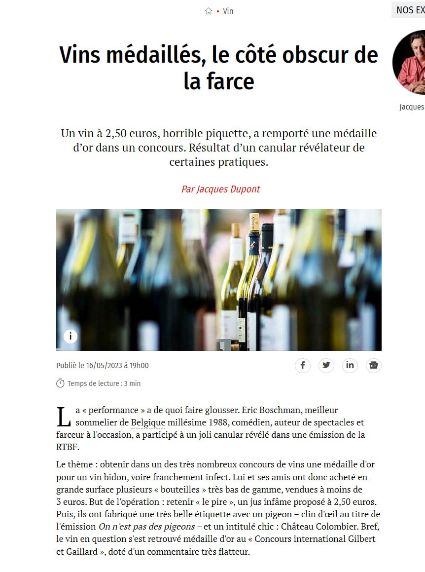 На винном конкурсе Gilbert et Gaillard победил "шмурдяк" за 2, 5 евро. Бельгийский сомелье Эрик Бошман купил в супермаркете самую дешевую бормотуху и отправился на престижный конкурс. Заплатил взнос 50 евро. В лабораторию на анализ выслал образцы более дорогого вина. А свой "кисляк" представил жюри, красиво и дорого оформив бутылку, и назвав вино - «Chateau Colombier». Жюри все понравилось. Вино назвали "интересным" с "богатым вкусом и молодыми ароматами". Вуаля - золотая медаль конкурса. Бошман не мошенник. Он просто таким спектаклем хотел показать, что все эти винные конкурсы полная чушь.