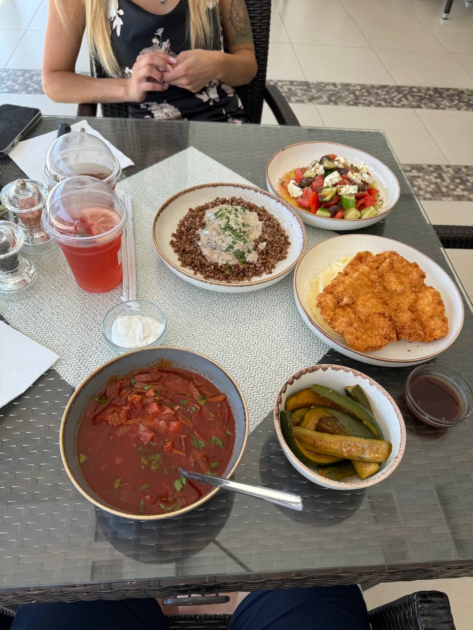 Нейтральный халлуми, вкусные греческий салат и фаршированный кальмар, но вернуться за ними не хочется.