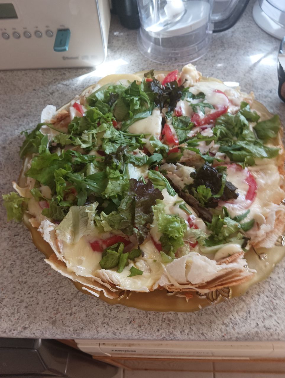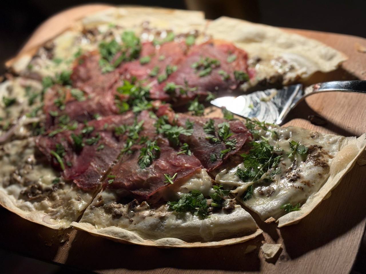 Пицца первая, и единственная мясная в меню, оказалась со сливочным соусом, ПЕТРУШКОЙ И ЛУКОМ. Еще и подавалась на тонком тесте а-ля фокачча или армянский лаваш. Вкус просто отвратительный.