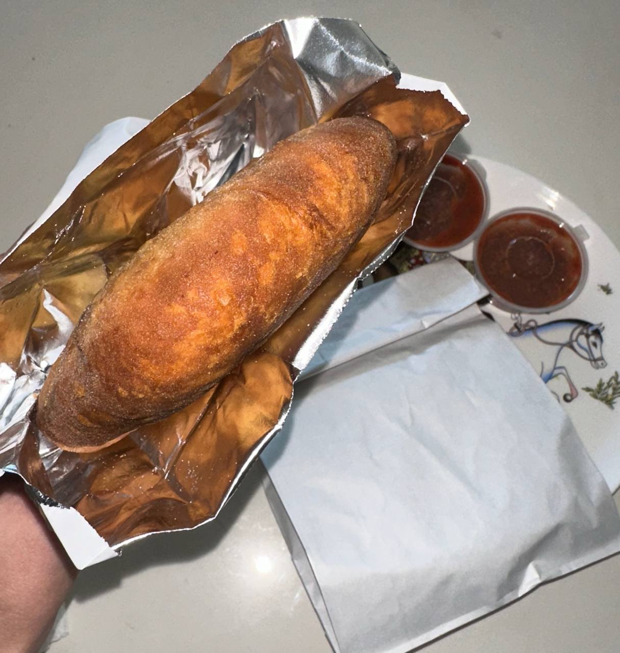 Булочка тоже мне больше нравится всё-таки классическая. Эта местами напоминала что-то между тостовым хлебом уже поджаренным и вафлей.