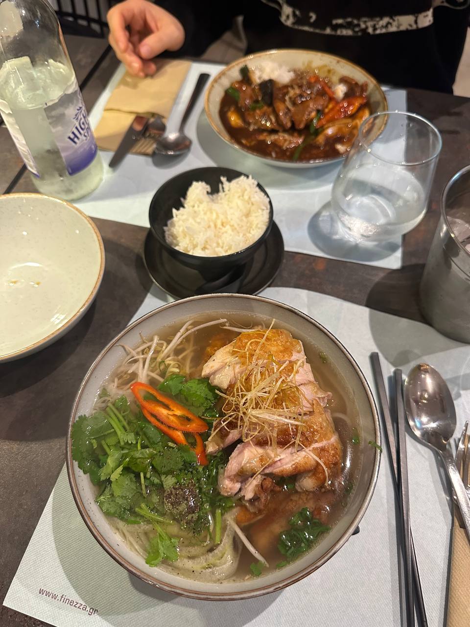Брали сечуан биф, к нему рис и куриный суп. Парень сказал, что говядина хоть не трушная, но вкусная, текстура нежная. (Перца раз в 10 меньше, чем в yummy, нам было достаточно, чтобы всплакнуть и вспотеть). Я была после отравления, поэтому целью был суп - бульон из фо и топ куриная грудка - сочная внутри с хрустящей корочкой снаружи. Обслуживание отличное. Обстановка - зал, внутренний дворик и раньше были столики на улице, главное не сесть у окна из кухни - шумно. Внутри обычно, я бы предпочла сесть на улице, если бы оставили столики, чтобы было темнее)