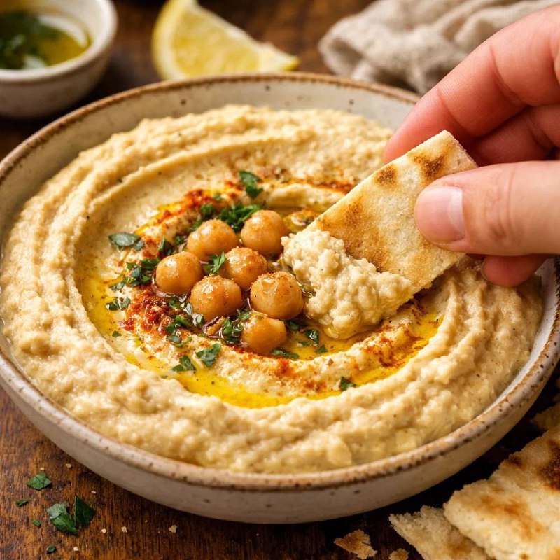 ✨ В правильной таверне хумус будет кремовым, с обязательной лужицей оливкового масла в центре и щепоткой паприки.
