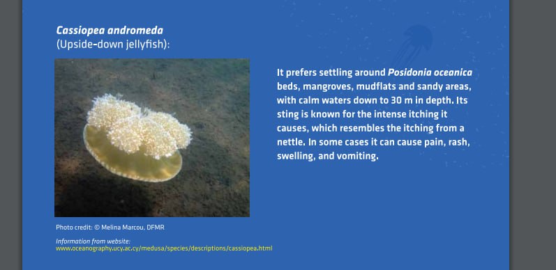 Гайд для пловцов от DFRM: опасные морские организмы Кипра http://www.moa.gov.cy/moa/dfmr/dfmr.nsf/All/4FE0FA6DACA61F3E4225846600267F1A/$file/VENOMOUS%20TRAUMATOGENIC%20MARINE%20SPECIES%20-%20WEB%20FINAL.pdf?OpenElement#:~:text=The%20venomous%20stinging%20cells%20of,anyone%20who%20touches%20their%20tentacles