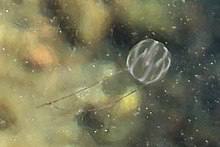 Не могли быть аппендикулярии? Они строят себе домики из слизи, довольно сложные, но снаружи примерно шарообразные. Не могу найти подходящее видео, везде только гиганта, снятого MBARI постят ))). Еще вариант - если эти шарики хоть как-то были похожи на крыжовник (то есть, с полосочками от одного полюса к другому), то могли быть гребневики.