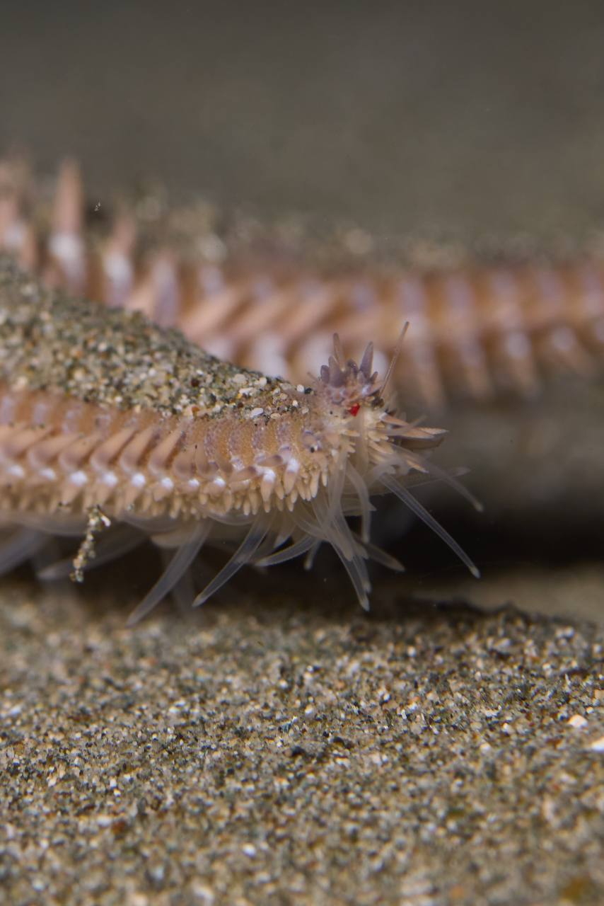 то, что выглядит бахромой - это не щупальца, а шипы скелетные. Они неподвижны. А маленькие ножки полупрозрачные снизу под каждым лучом, потому их и не видно