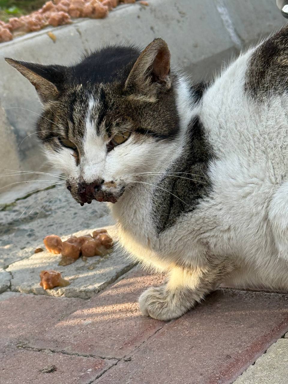 Состояние было критическим. У Санни, так мы назвали кошку, были тяжёлые травмы - перелом нижней челюсти и трещина в нёбе. Был пролапс глаза - его удалось вправить, сейчас он временно зашит, чтобы заживал. Сильный отёк головы, второй глаз залит кровью 😭