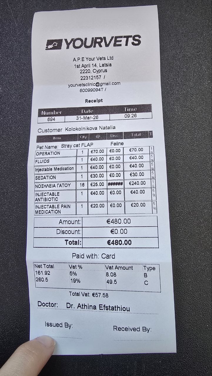 @nkolokolnikovaТакже очень рекомендую клинику YourVets в Лаче, Никосия — уже несколько раз принимали бродячих котов без записи, делали скидки на лечение и стерилизацию, отдавали котов на выходных когда приходили наблюдать за животными на стационаре, чтобы я не переплачивала за стационар.
