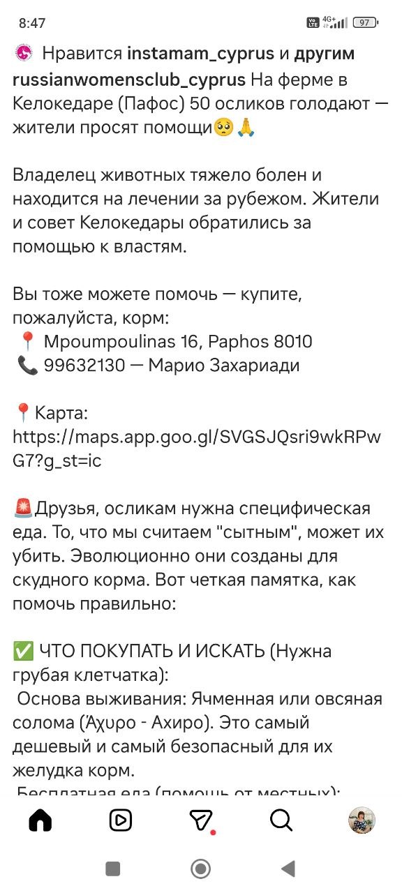 @LGalina_gallaДоброе утро!Вот такой пост сейчас попался в инстгр., если у кого то из живущих в Пафосе есть возможность помочь животным🙏не проходите мимо🙏помощь🆘