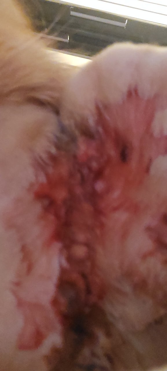 Котенок Мартин, который живет у меня на содержании в ожидании пристройства, неделю назад умудрился сдристнуть из дома и пойти гулять в сад. Там нашел склад старых деревяшек с гвоздями (мой косяк, каюсь🙈). Глубокой ночью вернулся домой с разодранным пузом и лег на диванчик в темном углу. Если бы не мой пёсик Мишка, я бы его только на следующий день обнаружила. И возможно было бы поздно. Моя клиника не отвечала, я даже на личный номер своему доктору звонила. Пришлось везти в SA. Осмотрели, сделали рентген, вкололи обезбол. Вроде всё нормуль, внутренние органы целы. Но на следующий день вписалась Катерина. Почистили, зашили, поставили дренаж. Она его вообще на третий день хотела домой выписать😵💫 Ок, в конечном итоге оставили на неделю. Прописали антибиотики на 10 дней, в клетку без возможности бегать/прыгать. И что я увидела сегодня? Половина швов разошлись😢