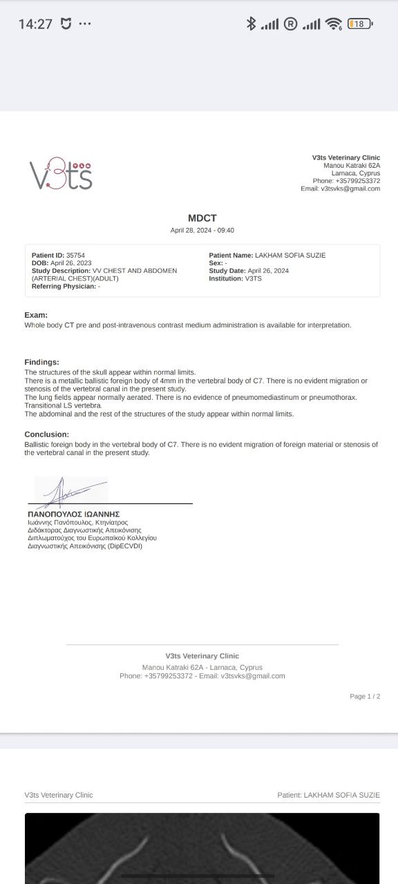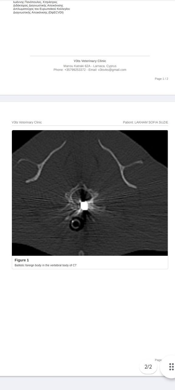 Пуля у С7 шейного позвонка. Операция сказали ничего не изменит и очень серьёзное место. Так что пока операция не планируется. Только прием антибиотиков. Потом ещё раз на прием в V3ts