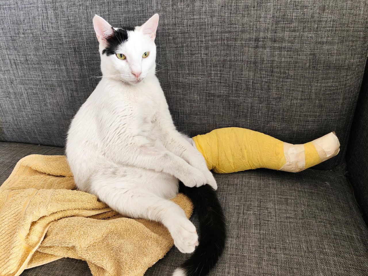 У кошки гипс? Это без колена? Или реконструкцию делали?