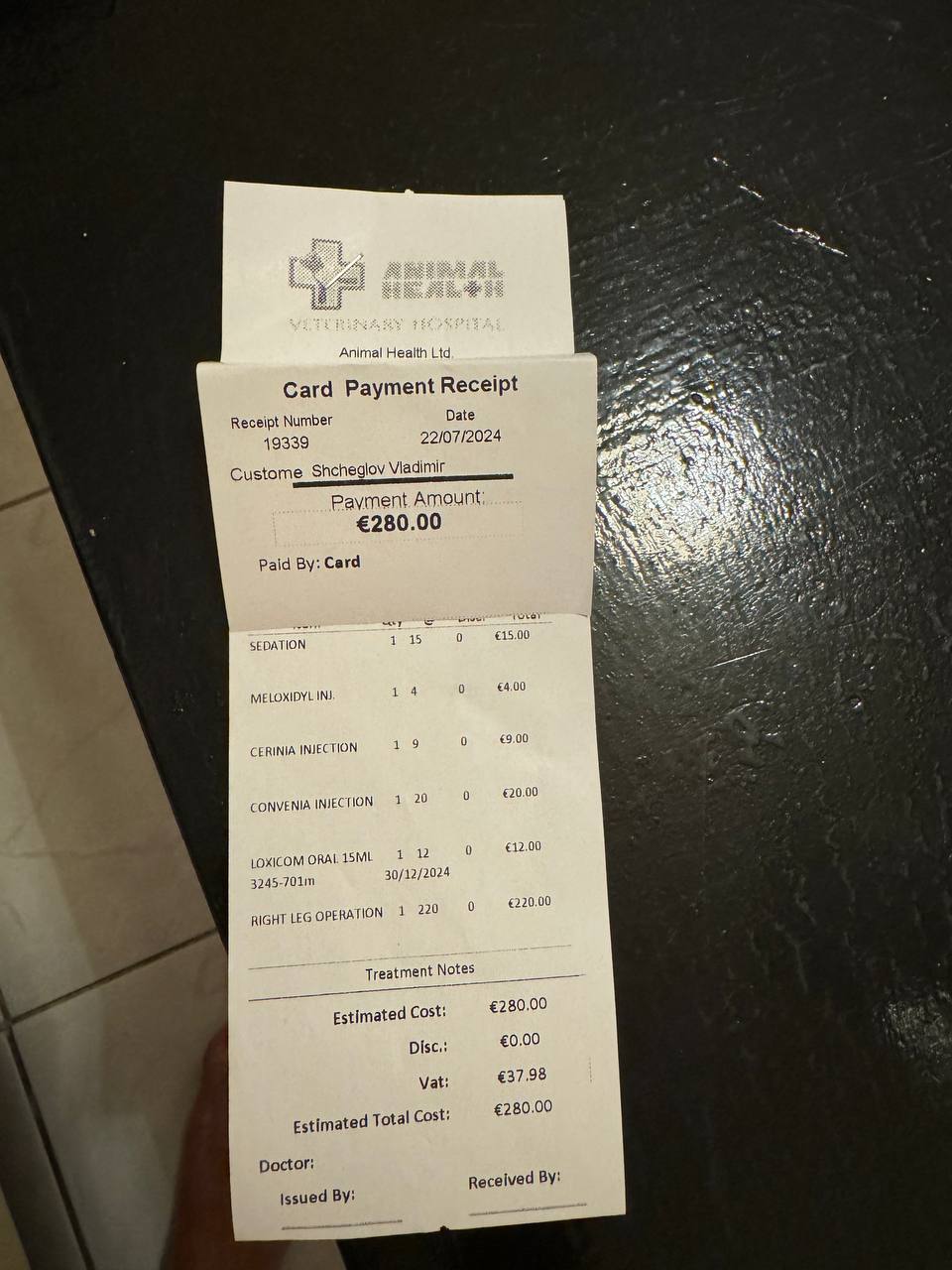 275€ операция и антибиотики + 35€ сегодняшний чек.