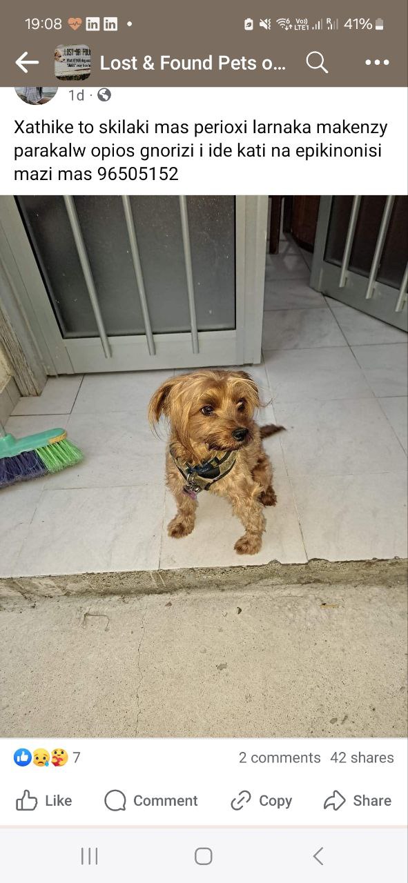 На шоссе рядом с деревней Apsiou обнаружили йоркширского терьера. Бегал по шоссе. При попытке приблизиться удрал на проселочную дорогу так быстро, что не успели догнать. Есть ошейник и адресник https://maps.app.goo.gl/pCjVJeTXVCbeJfZf6