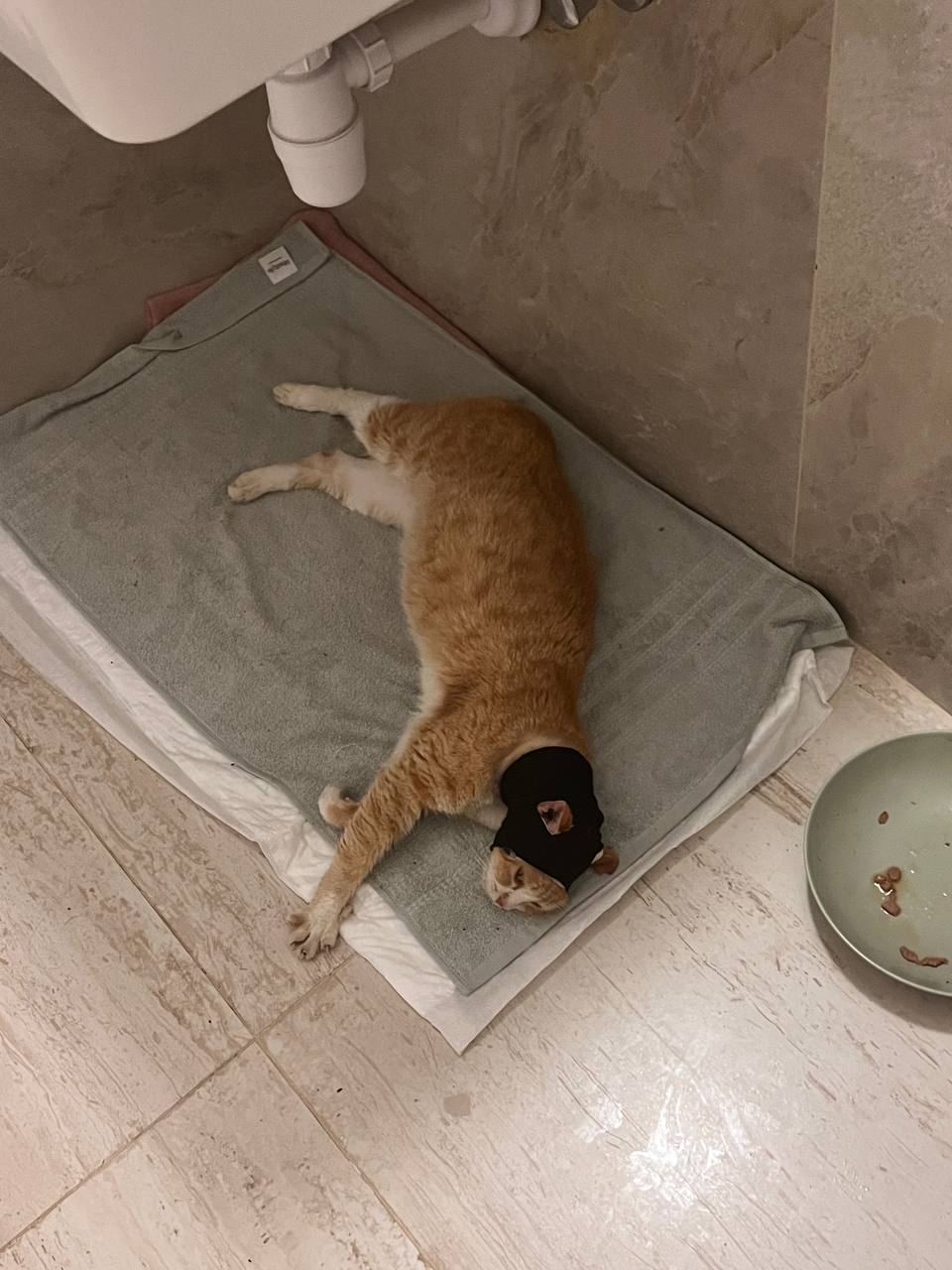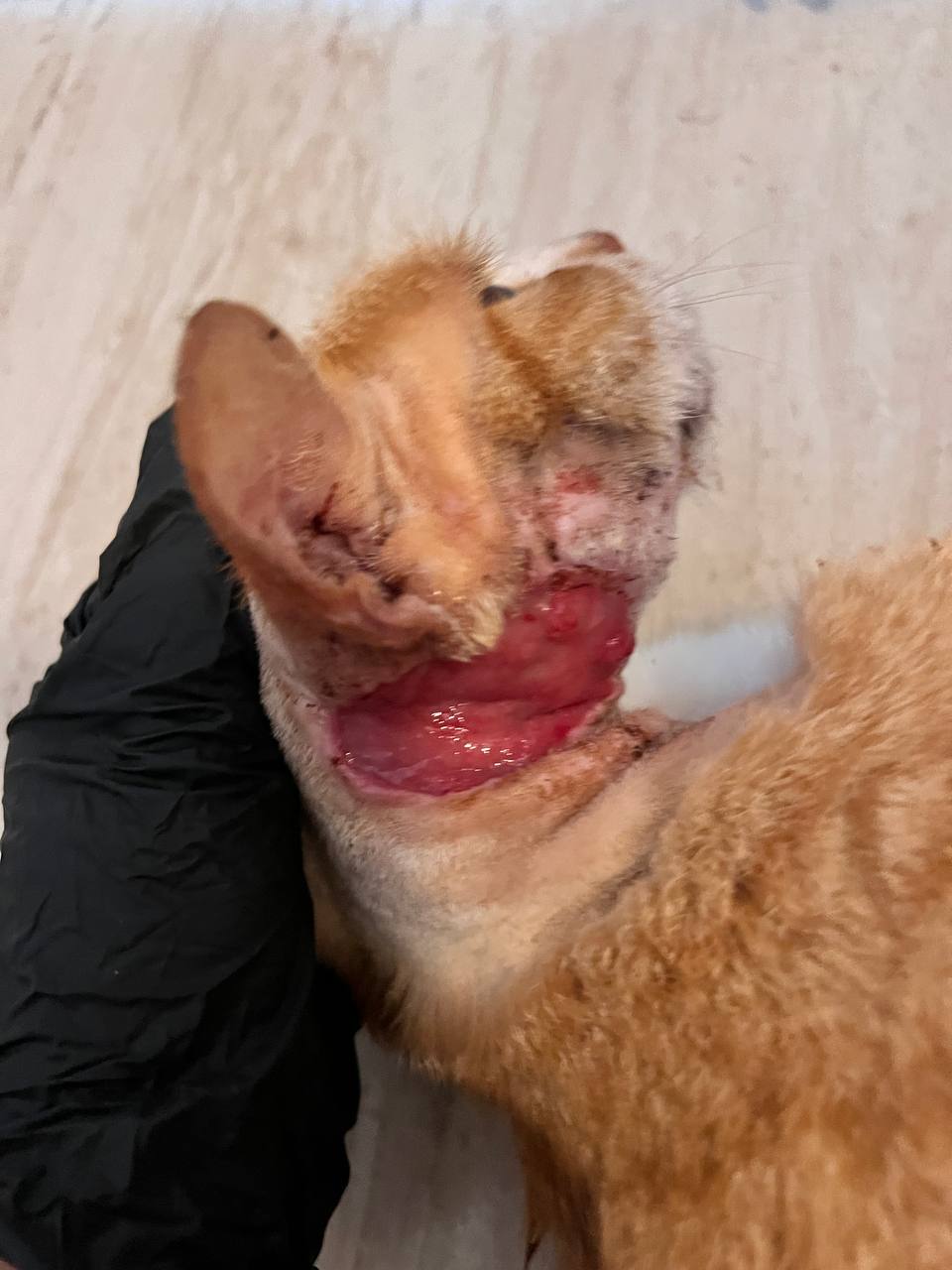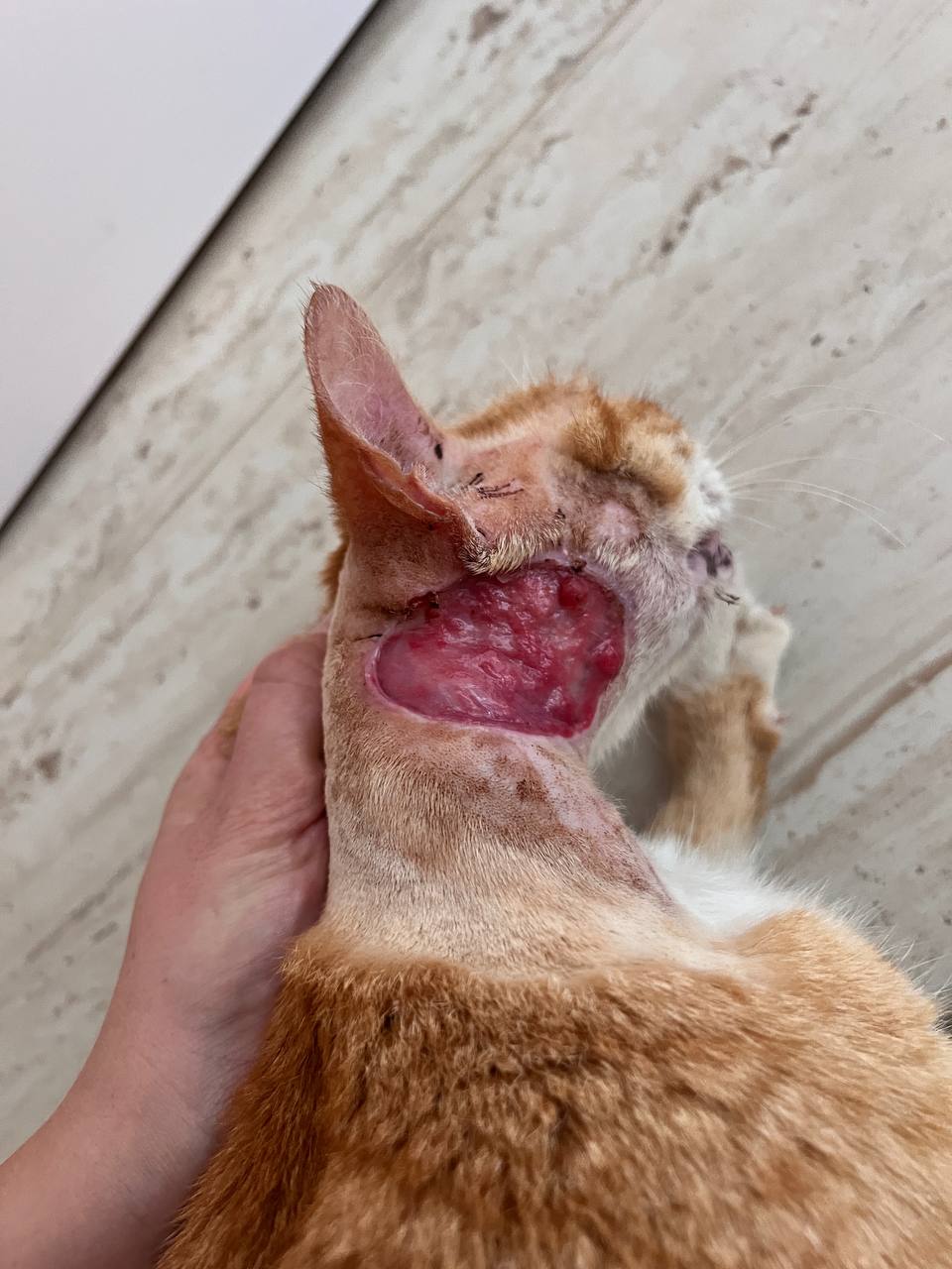 Сегодня девушка одолжила мне переноску, и я отвезла кошку в Animal Health, где ему поставили седативный укол, побрили, обработали рану, укололи антибиотик, капли от блох и клещей закапали, и показали, чем обрабатывать кота в течении 10 дней. Сказали если не поможет, то нужна операция по ушиванию раны (