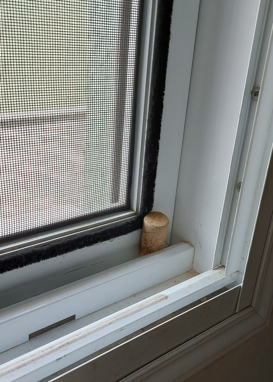 Мы блокируем куском пластикового профиля который лежит в желобке по которому рама с сеткой ездит 🙈