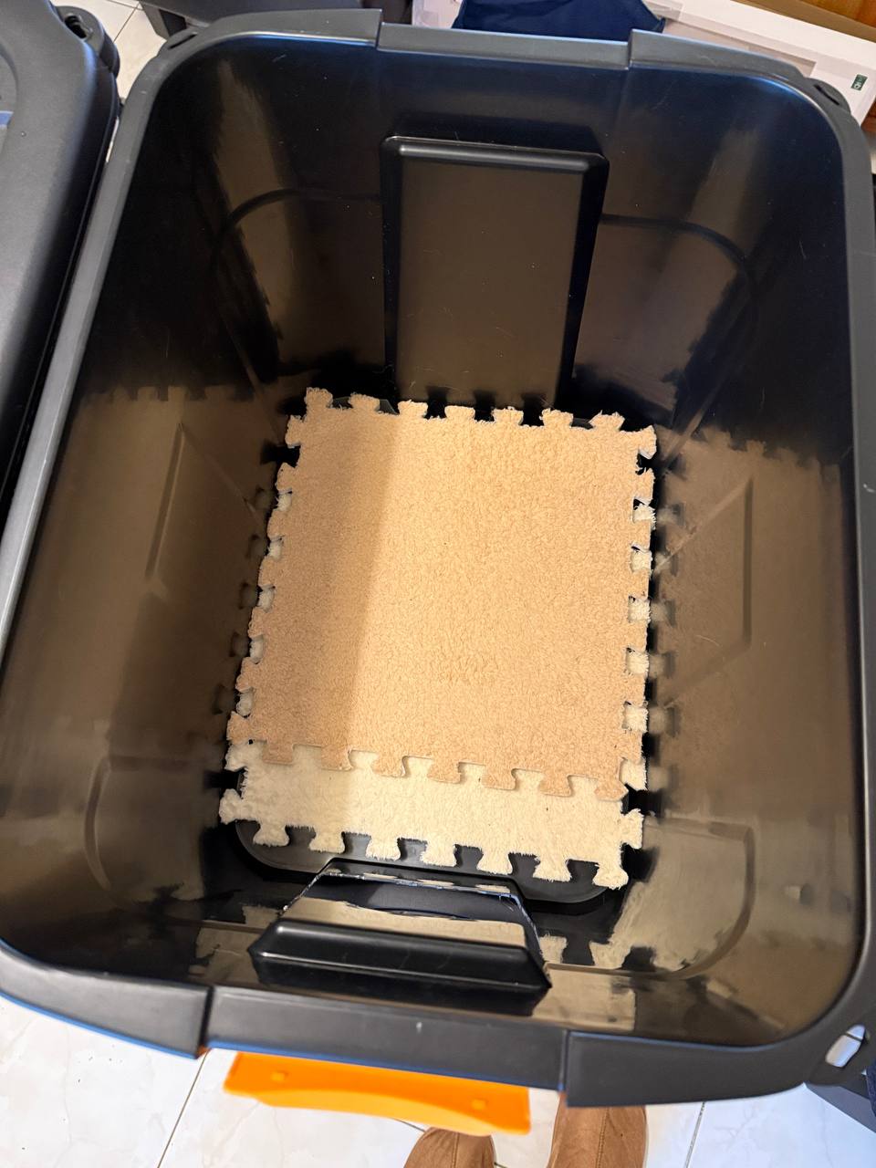 внутри утеплили: сначала несколько слоёв пупырки, потом толстая плюшевая подушка из Джамбо, потом пелёнка, всё скрепили;