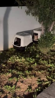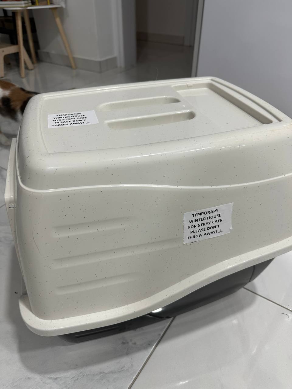 оборудовали пару зимних однушек для котят, которые живут у нас на парковке, обматывать не стали, в нашем случае наоборот они хорошо сливаются в кустах с травой и белой стеной, ещё приклеила такие предупреждения, чтобы случайно не подумали, что домики выставлены за ненадобностью;
