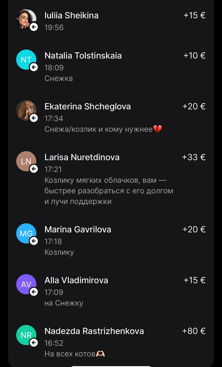 Если можно - все переводы, которые были с пометкой «кому нужнее» - я передам Снежке - сейчас ей срочно нужен кт скан и прием онколога😿