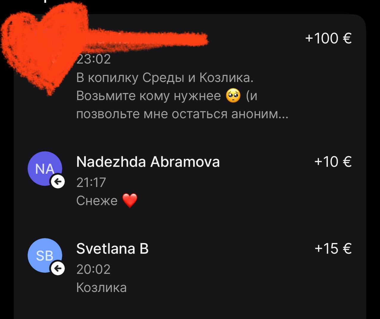 Надеюсь, Вы это прочтете - спасибо Вам за доверие!!! Спасибо за помощь!!!! ♥️♥️♥️ это огромная поддержка, и я не про финансы… спасибо, что увидели нас 💔♥️