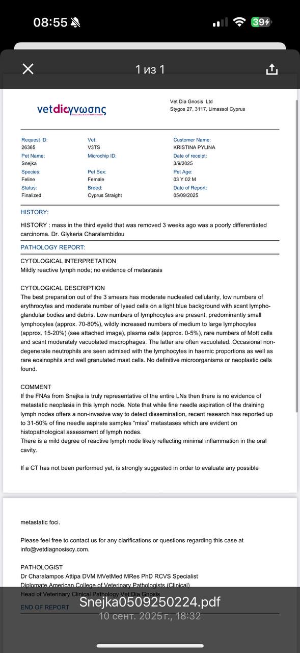 В заключении написано: «На этом этапе правильнее: Сделать ТАБ лимфоузлов (биопсия) - у Снежки взяли образец и отправили сразу, одновременно с кт - там все чисто 😍😍😍