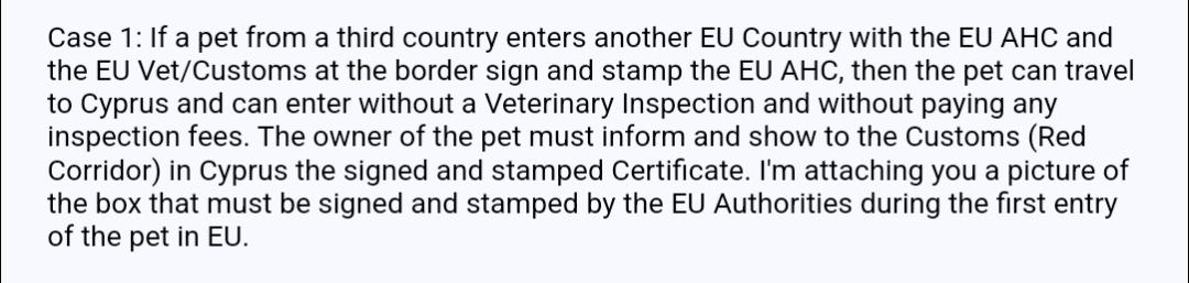 При описанных вводных на Кипре уже не нужно будет проходить ветконтроль и оплачивать за него сбор. Евросертификат с печатью и подписью уполномоченных органов другой страны ЕС нужно будет показать сотрудникам таможни Кипра в красном коридоре.
