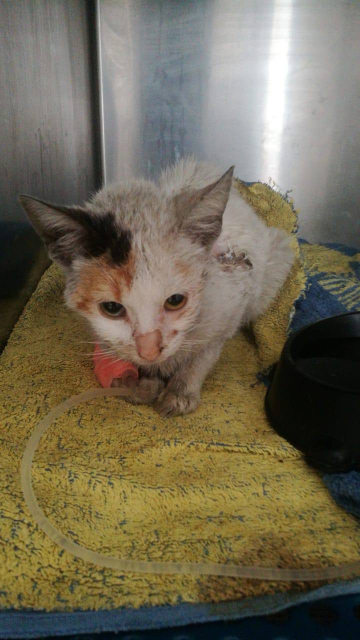 Котенок оказался живой, не реагировал, но дышал еле еле. Отвезли в клинику. Ему поставили капельницу, шансов сказали мало, но он даже головой пошевелил и мяукнул пару раз. До вечера оставили его в больнице, нсли прогресса не будет- усыпят :(. Нам сообщат