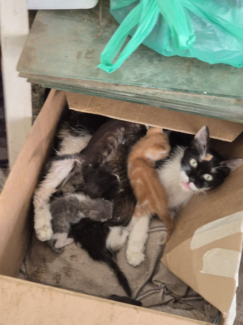 Тут около 11 котят разного возраста. Некоторые уже подросли, но есть и совсем крохи. Видимо, несколько кошек выбрали это место для родов — получилось небольшое стихийное "убежище".