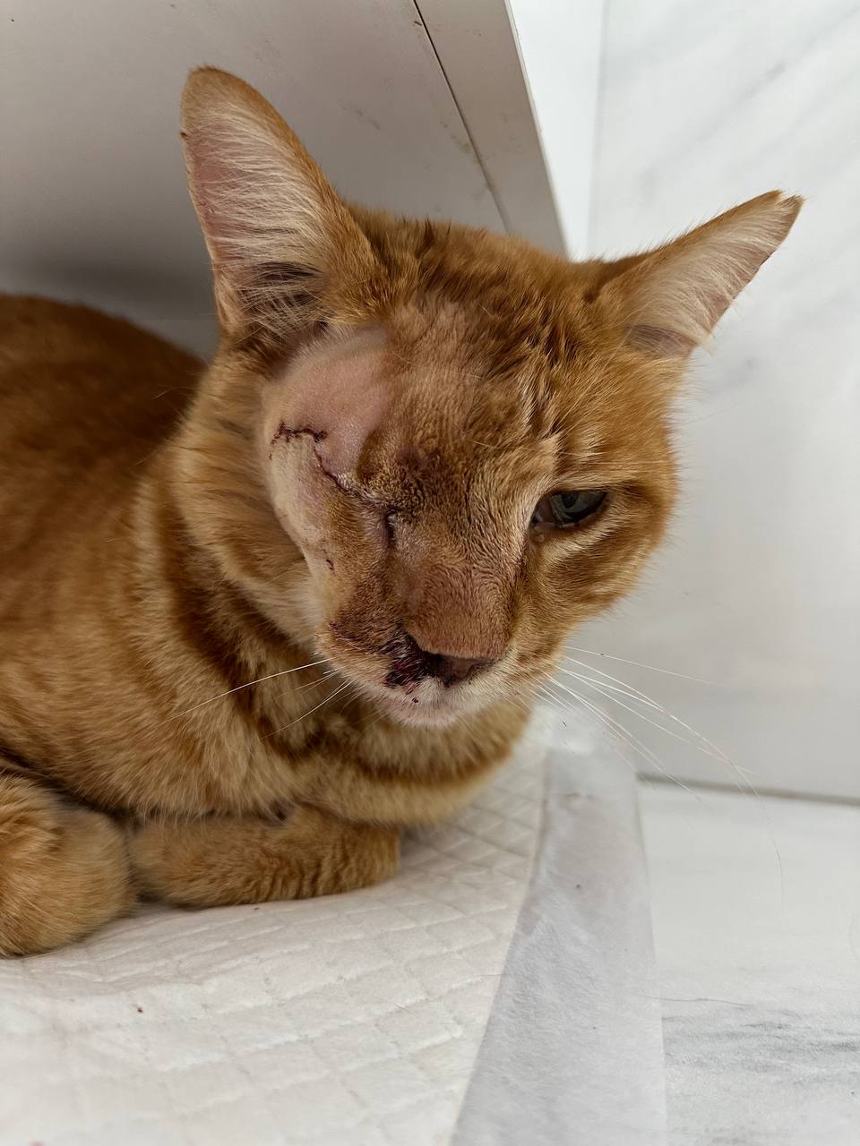 на фото без воротника, тк сняли на 5 минут протереть от крови и надеялись, что без него он поест, но нет.
