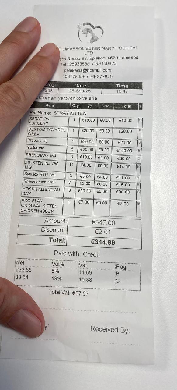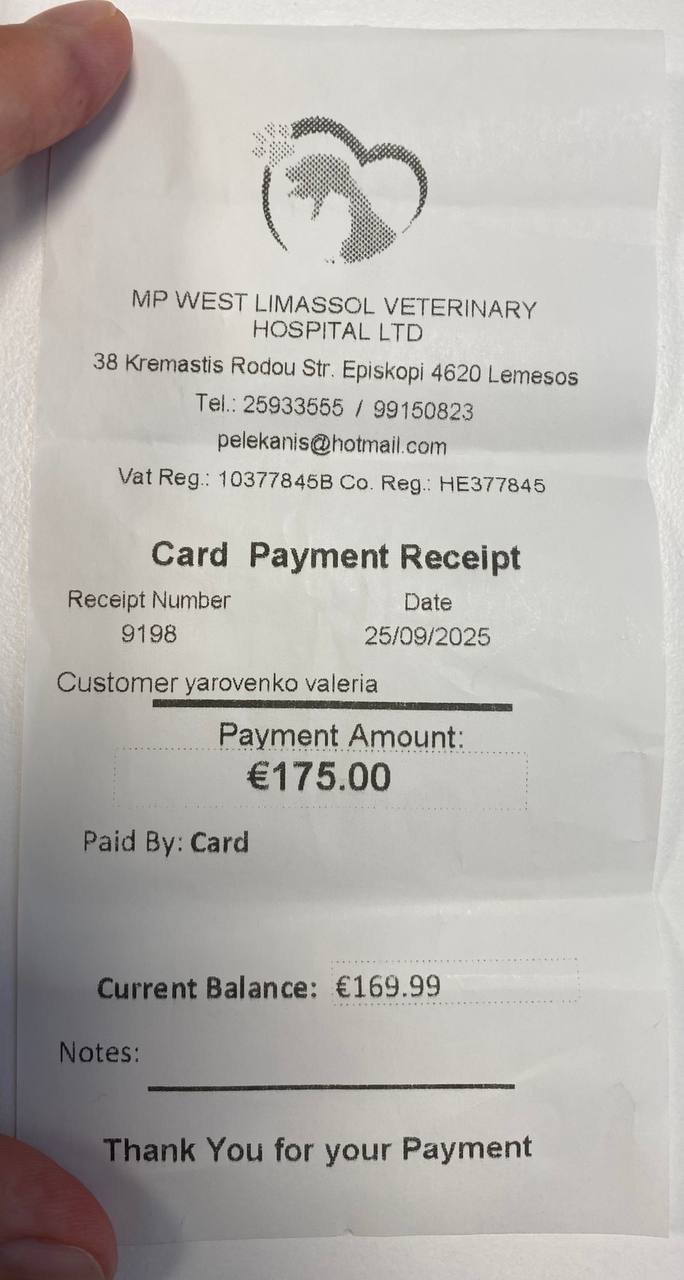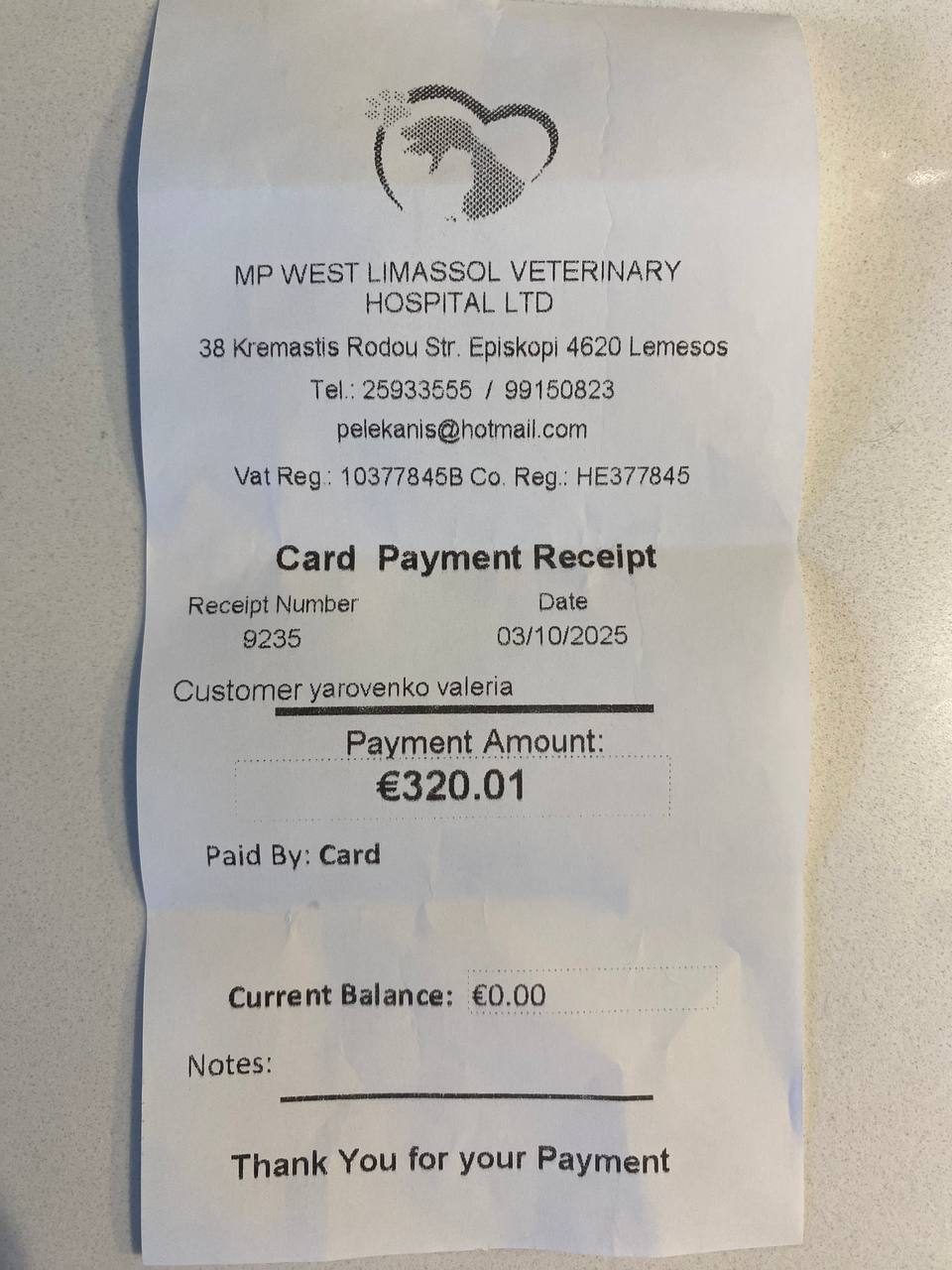 Вчера я ее забрала домой, операция прошла успешно, она уже пытается вставать на все 4 лапы, но у нее действительно есть проблемы с головой, непонятно что со зрением и двигается она только вокруг своей оси, ну ладно с этим потом буду разбираться. Публикую наконец фото рентгена, новый счет (который финально оказался меньше!) ресит с указанием оплаты и баланса.