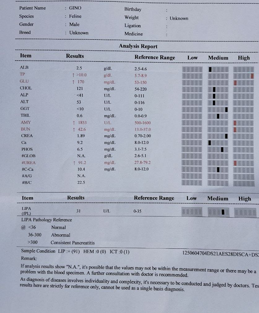 На данный момент для Джино собрано 102€, сможем оплатить один анализ крови и Снап тест на Fiv/felv, чеки будут приложены 🙏
